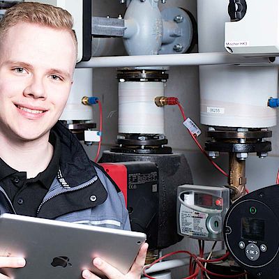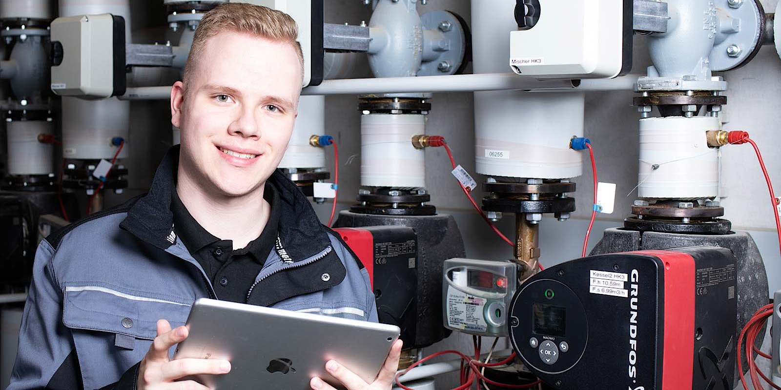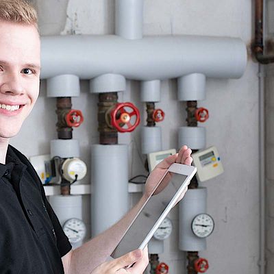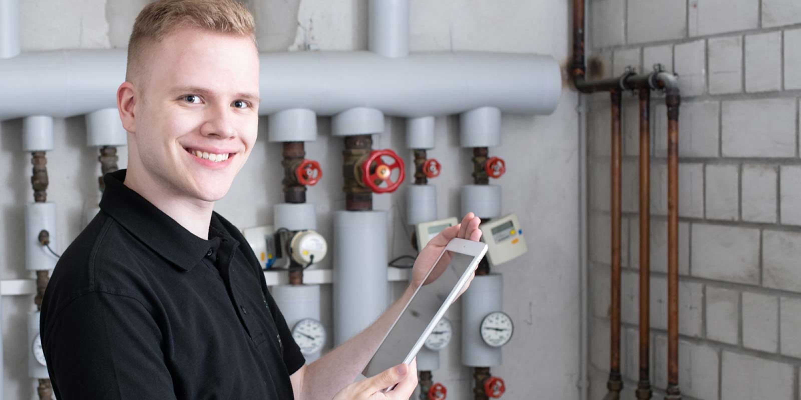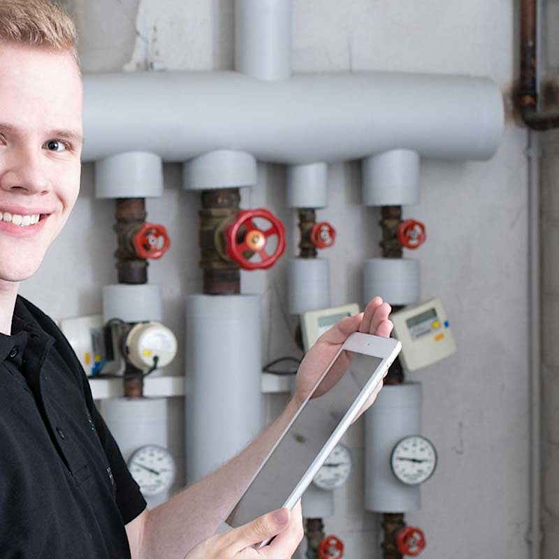 Andy ist Anlagenmechaniker für Sanitär, Heizung und Klima bei der Wärmetechnik Leickel mit Leib und Seele. In seinem Job stattet er Haushalte und Betriebe mit der passenden Heizungstechnik aus, baut Anlagen für die Wasserver- und entsorgung, richtet moderne Bäder ein und kümmert sich um umweltschonende Energietechnik.