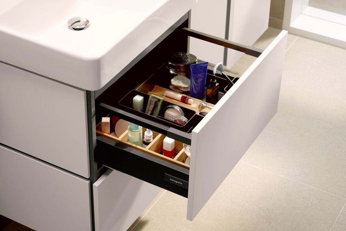 Für eine maßgeschneiderte Schubladenaufteilung bietet hansgrohe die optionalen IntraStoris-Module und -Sets an. Mit dieser Ergänzung wird der Stauraum im Waschtischunterschrank und Hochschrank optimal genutzt. Passende Xilesa Unterschränke und Hochschränke mit reduzierter Tiefe bieten ausreichend Platz für das Nötigste, selbst auf engem Raum. So sorgt hansgrohe Xilesa auch in kompakten Badezimmern für die nötigen Aufbewahrungsmöglichkeiten.