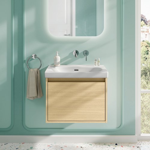 Die Vielseitigkeit von Skyla zeigt sich an der breiten Farbpalette und den flexiblen Größenoptionen. Acht moderne Farbtöne – von klassischem Brillant White über sanftes Soft Green bis hin zu warmem Nordic Oak – eröffnen zahlreiche Möglichkeiten für individuelle Looks. Auch bei den Größen bietet Skyla Spielraum: Mit sechs Varianten (von 55 bis 120 cm) passt sich der Schrankwaschtisch ideal an jede Raumgröße an. Auf Wunsch sind die Unterschränke mit einer oder zwei Schubladen erhältlich, wobei die Modelle in den Breiten 80 und 100 cm zusätzlich mit einem offenen Fach kombiniert werden können – die perfekte Ergänzung zum asymmetrischen Waschbecken.
